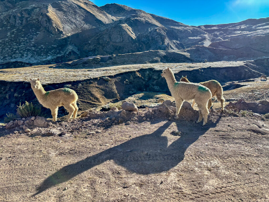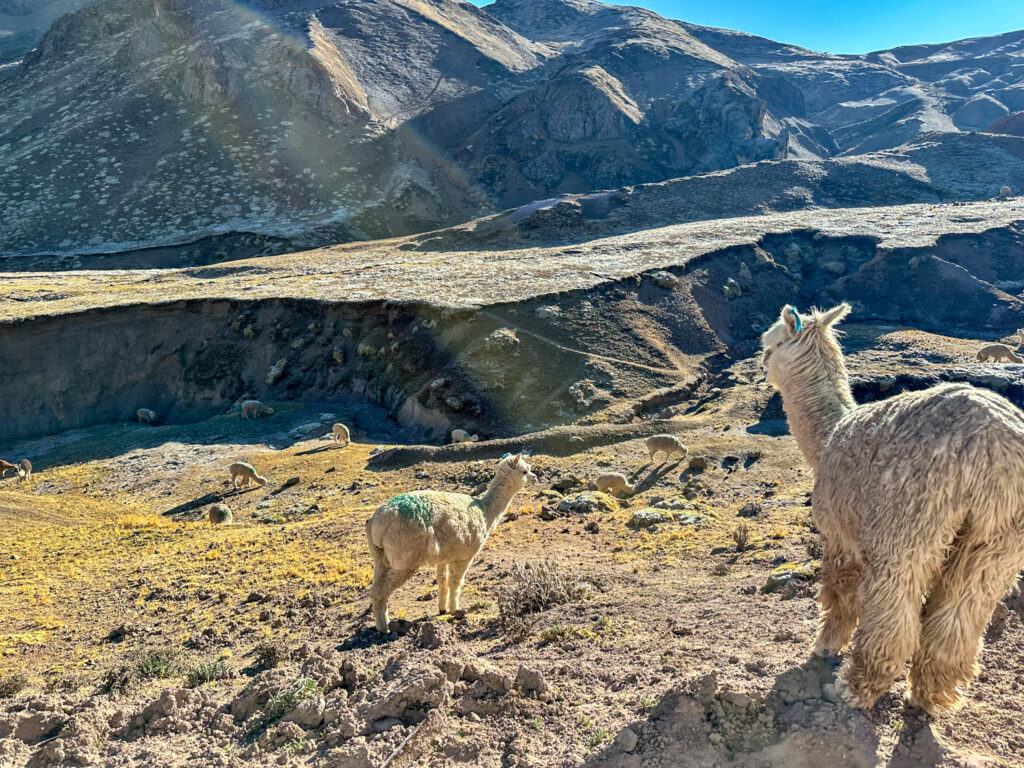 Weiter ging dann die Fahrt auf zunächst 4700m Höhe. Interessanter Zusammenhang, je unbefestigter die Straßen, desto größer die Alpaka Herden. 😁